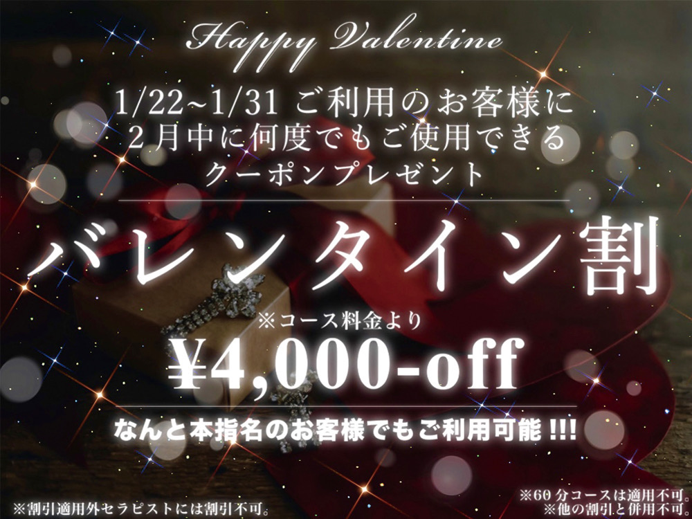 1/22(木)〜1/31(土)の期間中に 当店へご利用下さったお客様へ 2月中に何度も使用できる割引を 配布致します🌈🫶 題して‼️‼️ ❤️💛💚💙💜❤️💛💚💙💜 バレンタイン🈹¥4000off 本指 -