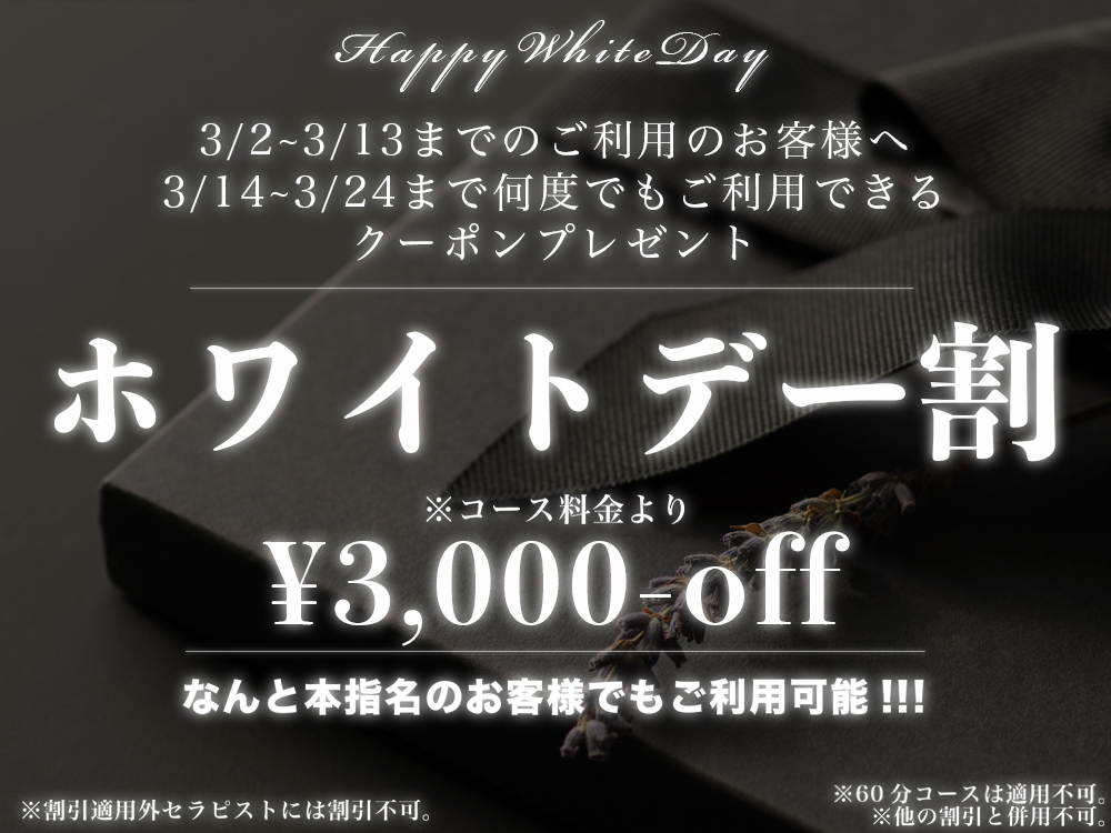 ❤️🧡💛💚💙❤️🧡💛💚💙 🍫🌹ホワイトデー🈹開催🎁 3/2-13迄の期間中 ご利用下さったお客様へ…💘 3/14-24迄何度でも ご利用頂けるイベント開催‼️ コース料金¥3000🈹🌹🤍🤎 ※60分コ -